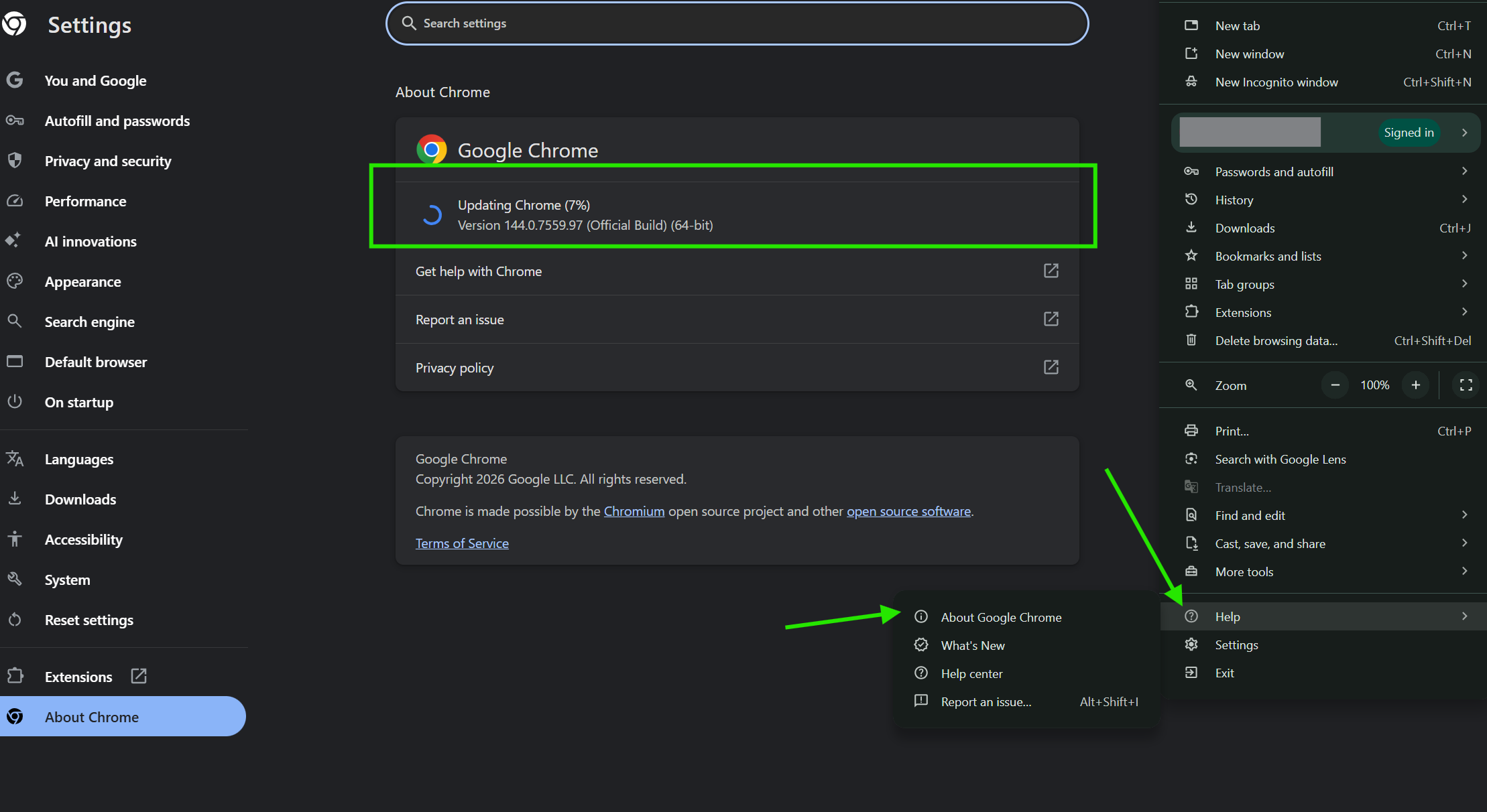 Hover over Help and select About Google Chrome.