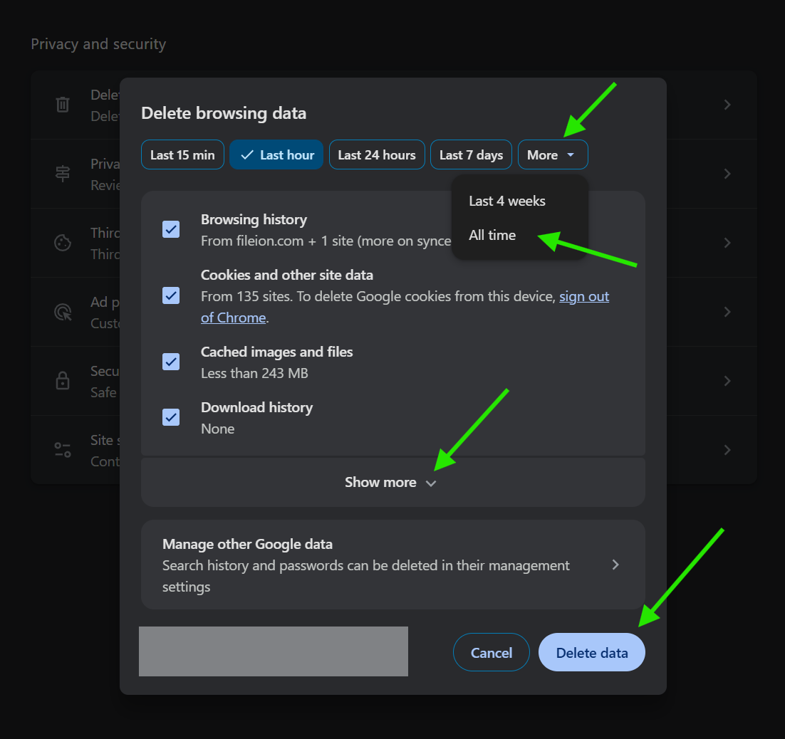 Check the boxes for Cookies and other site data, and Cached images and files.