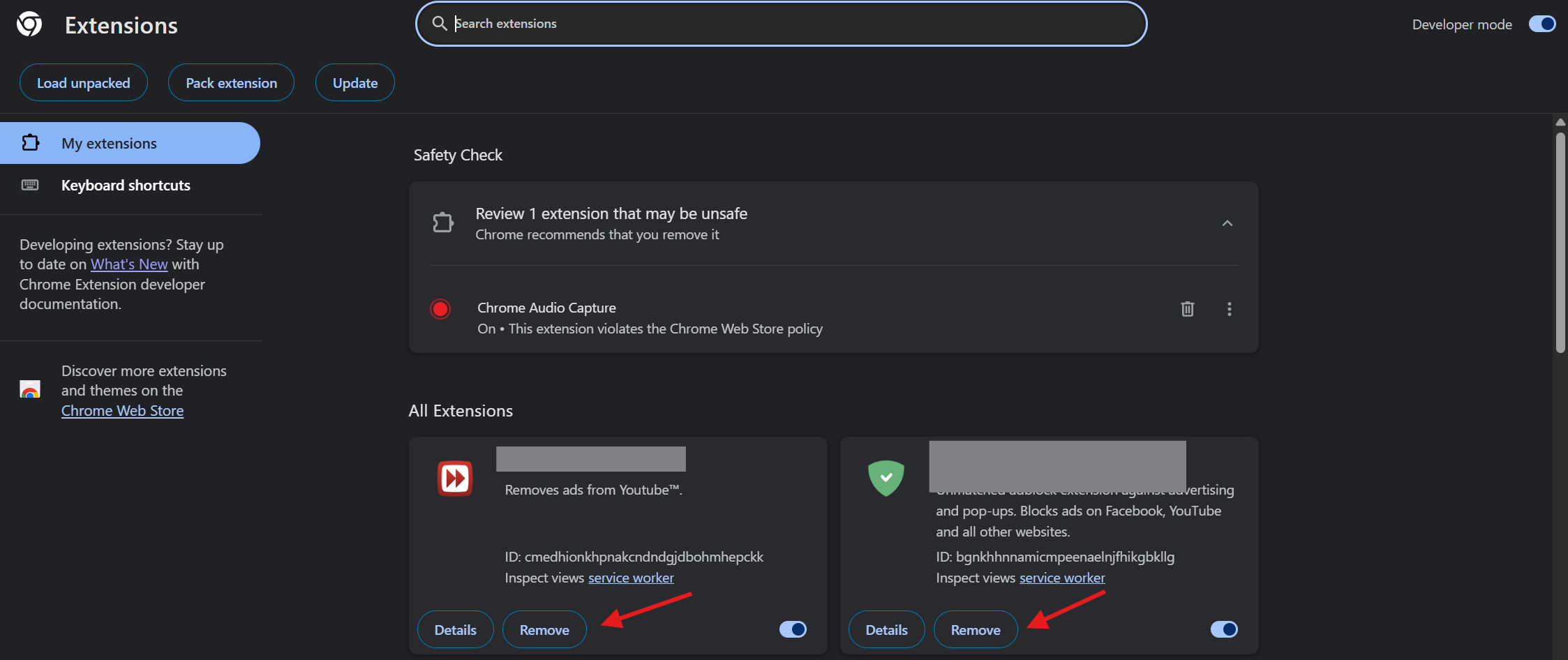 Click Remove for any extension you do not recognize or no longer need.