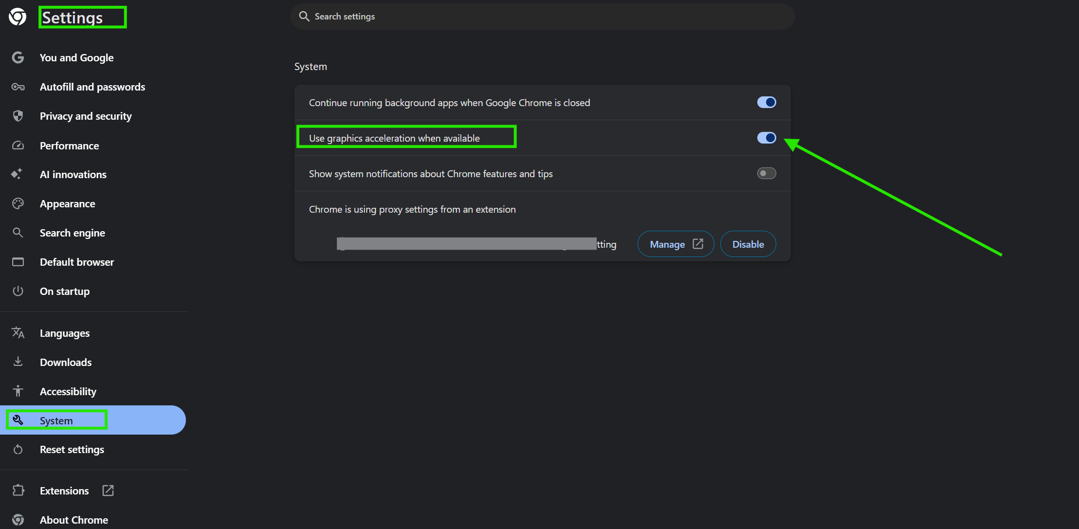 Ensure that the use of graphics acceleration, when available, is turned on. This lets Chrome use your computer's graphics card to handle visual tasks.