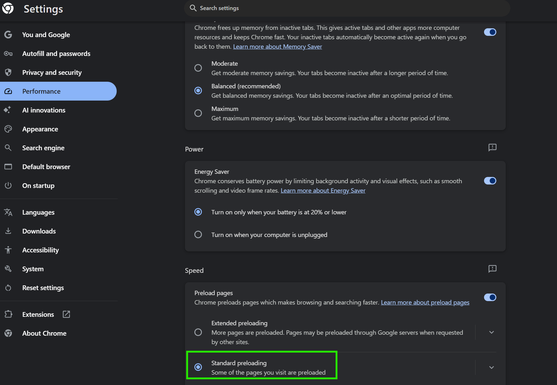 Once you have adjusted your settings, ensure that the "Preload pages" feature is active. This feature predicts which links you might click and starts loading them in the background.